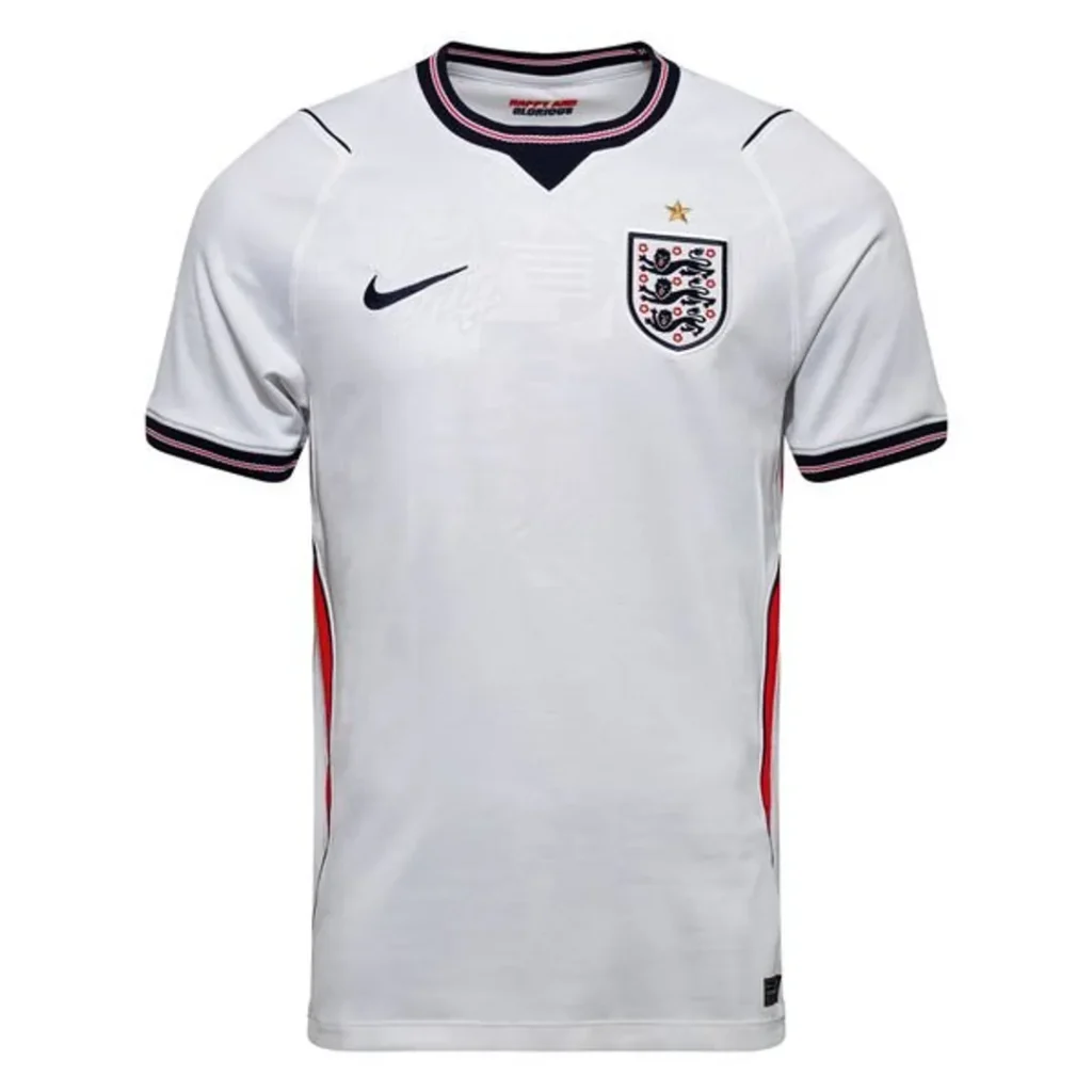 Den nye England hjemmedrakten for VM 2026 kombinerer tradisjonell eleganse med moderne detaljer som gjør den både stilren og funksjonell. Den klassiske hvite fargen dominerer, mens de subtile blå og røde kantene på ermene gir en frisk kontrast som hyller nasjonens flagg. En rød stripe langs siden tilfører ekstra dynamikk til designet.